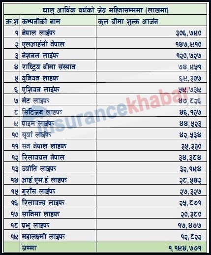जेठ महिनासम्ममा जीवन बीमाको कुल बीमा शुल्क आर्जन एक खर्ब १९ अर्ब नाघ्यो, कुन कम्पनीको कति (सूचिसहित)