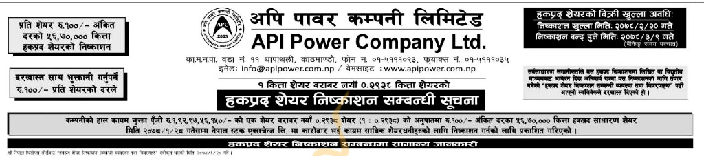 काठमाडौं । अपि पावर कम्पनी लिमिटेडले जेठ २० गतेबाट हकप्रद शेयर निष्काशन तथा बिक्री खुल्ला गर्ने भएको छ । कम्पनीले १ बराबर ०.२९३८ को अनुपातमा प्रतिशेयर १०० रूपैयाँ अंकित दरमा ५६ लाख ७० हजार कित्ता हकप्रद शेयर निष्काशन गर्न लागेको हो ।