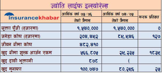 ज्योति लाइफले आर्थिक वर्ष ७५/७६ को तेश्रो त्रैमासको रिपोर्ट सार्वजनिक गरेको छ। कम्पनीले तेश्रो त्रैमास सम्म १० करोड ७ लाख रुपैया खुद नाफा गरेको छ। गत वर्ष कम्पनीले ८ करोड २ लाख रुपैया खुद नाफा गरेको थियो। खुद नाफा २५ प्रतिशतले वृद्धि भएको छ। कम्पनीको प्रकाशित प्रति शेयर आम्दानी ८ रुपैया ७२ पैसा छ।