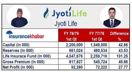 कम्पनीले प्रकाशित चालु आर्थिक वर्षको वित्तीय विवरण अनुसार अघिल्लो आ.व.को सोही अवधिको तुलनामा यस आ.व.को पहिलो त्रैमासमा कुल बीमा शुल्कमा ५० प्रतिशतले वृद्धि भएर ८१ करोड ७८ लाख आर्जन गरी कुल लगानी रकममा ८२ प्रतिशत ले वृद्धि गरेको छ भने खुद नाफामा २८ प्रतिशतले वृद्धि गर्दै ९ करोड २२ लाख नाफा गर्न सफल भएको छ ।