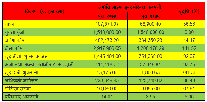 कम्पनीले यस वर्ष पोलिसी संख्या ७६ प्रतिशतले बढाएको छ। कम्पनीले १६ हजार ६८६ वटा बीमा पोलिसी बिक्री गर्न सफल भएको छ। यस वर्ष कम्पनीले १५ करोड १७ लाख रुपैयाँको दाबी भुक्तानी गरेको छ। गत वर्षको यहि अवधिमा १८ लाख तीन हजार रुपैयाँको दाबी भुक्तानी गरेको थियो। यस वर्ष दाबी भुक्तानी ८ गुणाले बढेको छ। नाफामा सुधार सँगै कम्पनीको प्रतिशेयर आम्दानी ५ रुपैयाँले बढेर १४ रुपैयाँ पुगेको छ।