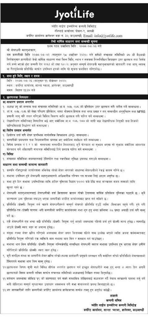 ज्योति लाइफको साधारण सभा भोलि,आइपिओ निष्काशन गर्ने विशेष प्रस्ताव पारित हुने