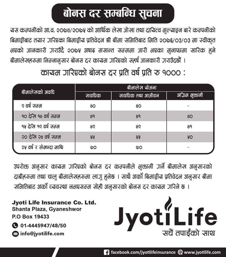 ज्योति लाइफ इन्स्योरन्स कम्पनी लिमिटेडले बोनस दर घोषणा गरेको छ । इन्स्योरेन्सले बीमितलाई दिने बोनस दर घोषणा गरेको हो । कम्पनीले प्रतिहजार न्युनतम ४० देखि ७० रुपैयाँसम्म बोनस दिने घोषणा गरेको छ ।
