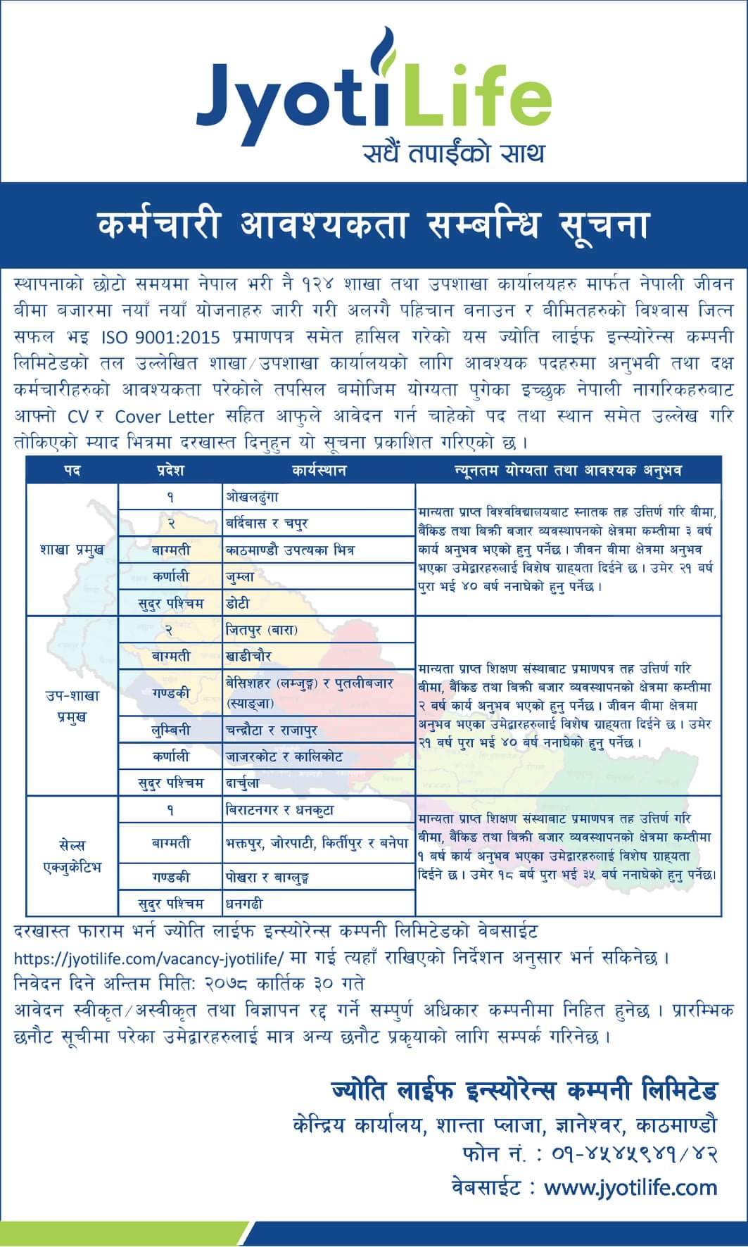 कम्पनीले आफ्नो उपत्यका बाहिरका विभिन्न शाखा तथा उप शाखा कार्यालयका लागि कर्मचारकिो माग गरेको जनाएको छ । ईच्छुक तथा योग्यता पुगेकाले कार्तिक ३० गतेभित्र आवेदन दिइसक्नुपर्नेछ ।