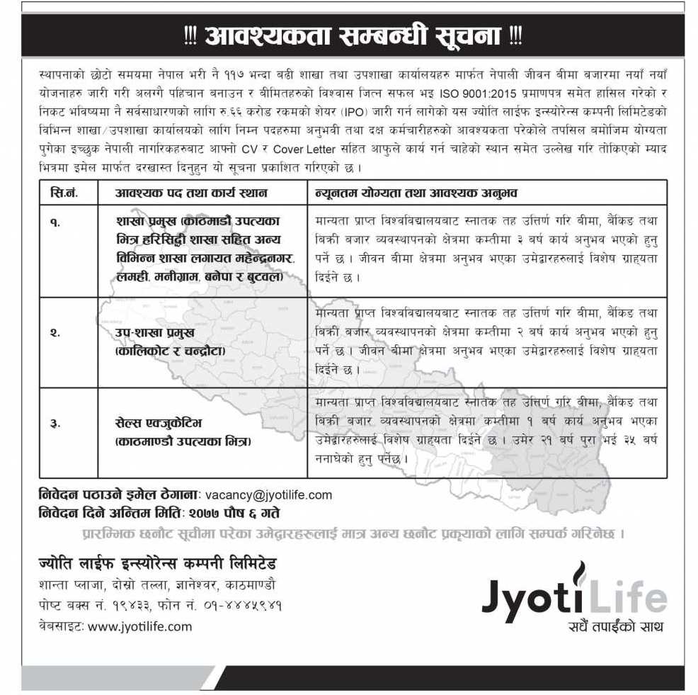 कम्पनीले उपत्यका भित्र तथा बाहिरका आफ्नो विभिन्न शाखा तथा उपशाखा कार्यालयका लागि कर्मचारीको माग गरेको जनाएको छ । ईच्छुक तथा योग्यता पुगेका नेपाली नागरिकहरूले पुष ६ गतेभित्र कार्यालय समयभित्र आवेदन दिइसक्नुपर्ने छ ।