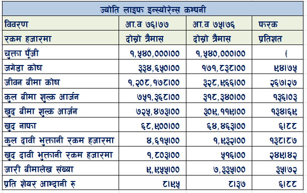 ज्योति लाइफ इन्स्योरेन्स कम्पनीको चालु आर्थिक वर्षको दास्रो त्रैमास र अघिल्लो आर्थिक वर्षको सोही अवधिको वित्तीय विववरणलाई दाँजेर हेर्दा : चालु आर्थिक वर्षको दोस्रो त्रैमासको वित्तीय विवरण प्रकाशन गर्ने पहीलो जीवन बीमा कम्पनी बन्न सफल भएको छ । हाल १ अर्ब ५४ करोड रुपैयाँ चुक्ता पूँजी रहेको ज्योति लाइफ इन्स्योरेन्स कम्पनीले जगेडा कोषमा ३३ करोड ४६ लाख रुपैयाँ संचिती गरेको छ । गत आर्थिक वर्षको सोही अवधिमा कम्पनीले १७ करोड १८ लाख रुपैयाँ संचिती गरेको थियो । गत आर्थिक वर्षको सोही अवधिको तुलनामा कम्पनीको जगेडा कोषमा संचिती ९५ प्रतिशतले धेरै हो ।