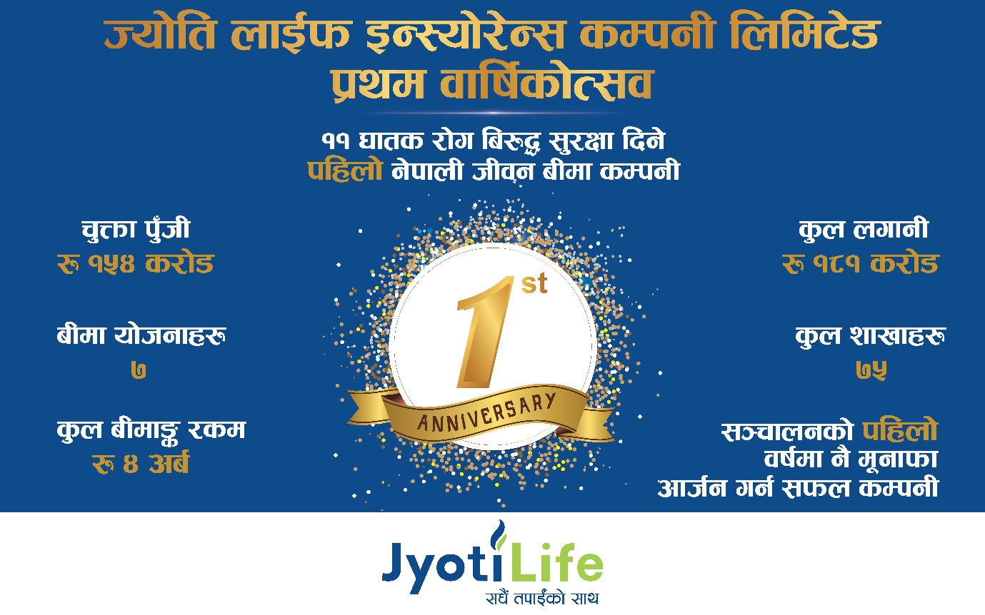 ज्योति लाईफ इन्स्योरेन्स प्रथम वर्ष सफलताका साथ पुरा गरि दोश्रो वर्षमा प्रवेश गरेको छ। कम्पनीले सञ्चालनको एक वर्षमा देशका ७५ ओटै जिल्लामा शाखा संजाल बिस्तार गरेको छ।