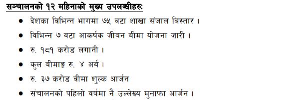 त्यस्तैगरि, विभिन्न ७ वटा आकर्षक जीबन बीमा योजना मार्फत सेवा दिदै आएको कम्पनीले जनाएको छ । हाल कम्पनीको लगानी १८१ करोड रुपैयाँ पुगेको छ भने कम्पनीले संचालनको एक वर्षको अबधिमा कुल बीमाङ्क ४ अर्ब रुपैयाँको बीमालेख जारी गरेको छ, सो अबधिमा कम्पनीले ३७ करोड पहिलो वीमा शुल्क आर्जन गरेको जनाएको छ ।