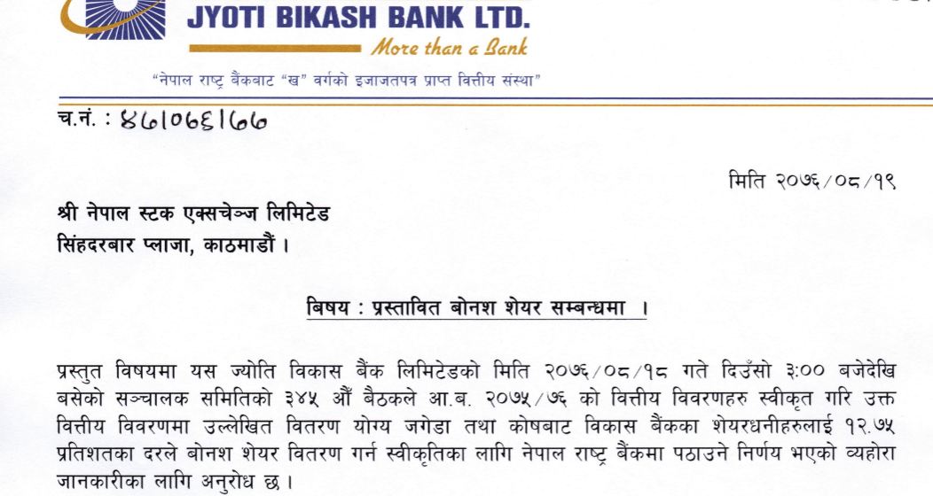 काठमाडौं । ज्योति विकास बैंकले १२ दशमलव ७५ प्रतिशत बोनस शेयर दिने घोषणा गरेको छ । बैंकको बुधबार बसेको सञ्चालक समिति बैठकले गत वर्षको नाफाबाट १२ दशमलव ७५ प्रतिशत बोनस सेयर दिने निर्णय गरेको हो ।
