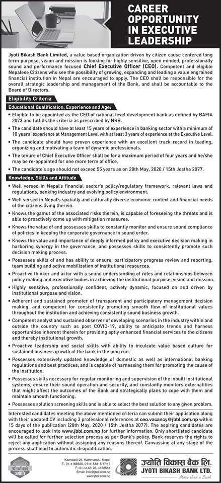 काठमाडौैं । ज्योति विकास बैंकले प्रमुख कार्यकारी अधिकृत (सिइओ) नियुक्तीको लागि आवेदन माग गरेको छ । बैंकले रिक्त रहेको प्रमुख कार्यकारी अधिकृत (सिइओ)को पदका लागि आकांक्षीहरुका लागि दरखास्त आब्हान गरेको हो ।