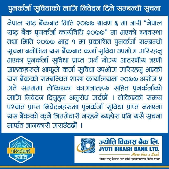 काठमाडौं । ज्योति विकास बैंकले लिमिटेडले आफ्ना ग्राहक तथा ऋणीहरुलाई पुनरकर्जाको लागि आवेदन दिन आग्रह गरेको छ ।