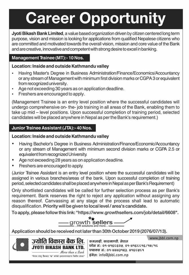 काठमाडों । ज्योति विकास बैंकले विभिन्न पदका लागि कर्मचारीको माग गरेको छ । बैंकले म्यानेजमेन्ट ट्रेनीका लागि १० जना, जूनियर ट्रेनी असिस्टेन्टका लागि ४० जना गरी जम्मा ५० जना कर्मचारीको माग गरेको हो ।
