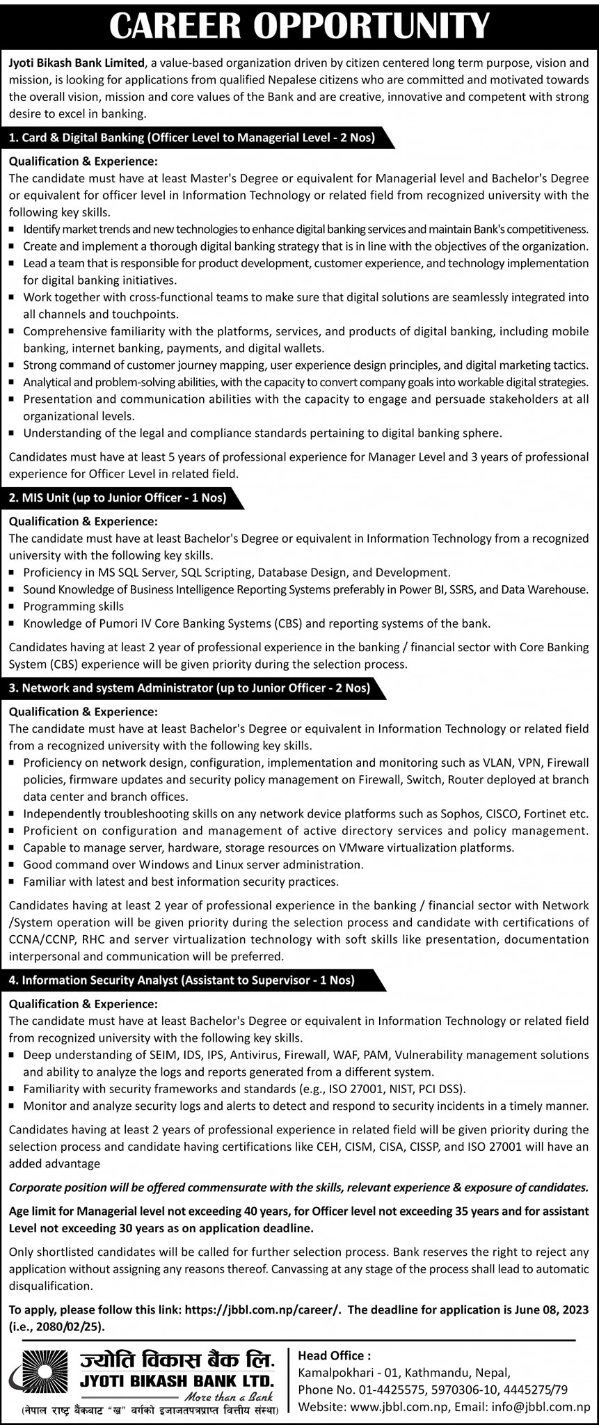 काठमाडौं । ज्योति विकास बैंक लिमिटेडले कर्मचारी माग गरेको छ । बैंकले कार्ड एण्ड डिजिटल बैकिङ्गमा अफिसर लेभल देखि म्यानेजरियल लेभलका केही, मिस युनिटका लागि जुनियर अफिसरमा केही, नेटवर्क एण्ड सिस्टम एडमिनिस्ट्रेटरका लागि जुनियर अफिसर र इन्फरमेशन सेक्युरिटी एनलायस्टमा असिस्टेन्ट टु सुपरभाइजरका लागि केही संख्यामा कर्मचारी माग गरेको हो । ईच्छुक तथा योग्यता पुगेका ब्यक्तिले जेठ २५ गतेसम्म दरखास्त दिन सक्नेछन् ।