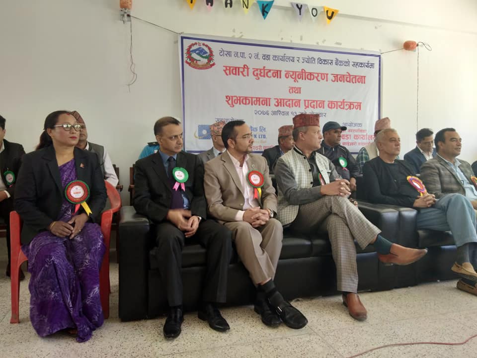 सो कार्यक्रममा टोखा वडा नं २ का वडाध्यक्ष दिपकराज जोशको सभापतित्वमा सम्पन्न कार्यक्रममा कार्यक्रममा ज्योति विकास बैंकका प्रमुख कार्यकारी अधिकृत ज्ञवालीले आगामी दिनहरुमा पनि मेचीदेखि महाकालीसम्म सक्दो सहयोग पुर्याउने प्रतिबद्धता जनाएका छन् ।