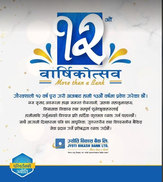 काठमाडौं । ज्योति विकास बैंकले १२ औ बर्ष पूरा गरेर १३ औ बर्षमा प्रवेश गरेको छ। शुक्रबारदेखि बैंक १३ औ बर्षमा प्रवेश गरेको हो ।