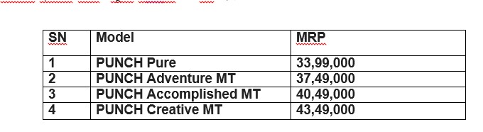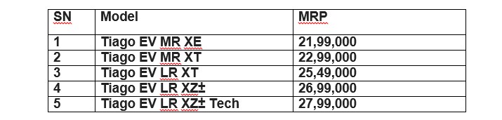 त्यसैगरी, टाटाको “न्यु फरेभ” रेञ्ज अन्तर्गतको टाटा पन्चको चार आधारस्तम्भहरु हुन् आकर्षक डिजाइन, विशेष कार्यक्षमता, फराकिलो इन्टेरिएर र पूर्ण सुरक्षा रहेका छन । नँया युग सुहाँउदो सोच र प्रविधिमा आधारित यो गाडीले ग्राहकहरुको बदलिदो इच्छा एवं आकांक्षाहरुको परिपूर्ति गर्दछ । टाटा पन्च हाल भारतीय बजारमा सबैभन्दा बढी विक्री भइरहेको सब कम्प्याक्ट एसयुभी रुपमा पनि परिचित छ । टियागो इभीको बजार मूल्य यसप्रकार रहेको छ ।