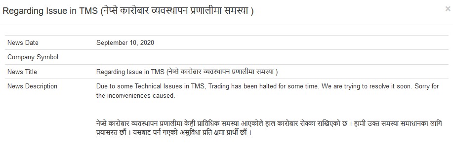 नेप्सेले केहीबेर अघि सूचना जारी गर्दै टिएमएसमा समस्या आएपछि कारोबार स्थगित गरिएको जनाएको छ । कारोबार स्थगित हुँदा नेप्से छ अंकले बढेको अवस्था छ । आज बजार खुलेको केही समय शेयर कारोबार भएपछि ब्रोकर कम्पनीको युजरहरु स्वतः लगआउट भएका थिए ।