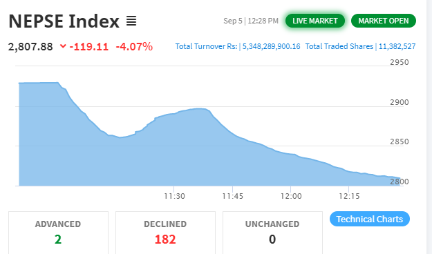 काठमाडौं । शेयर बजार कारोबार खुलेको डेढ घण्टामै ११२ अंकले घटेको छ । नेपाल राष्ट्र बैंकको शेयर बजार प्रतिको उदारताले बजार घटेको लगानीकर्ताको आरोप छ । शेयर बजारमा केहि दिन देखिको लगातार गिरावटले बैंकहरुले मार्जीन कल गर्न थालेका छन् । शेयरधितो कर्जा लिएका ऋणीलाई मूल्याङ्कन भन्दा तल झरेको भन्दै बैंकहरुले शेयर धितो कर्जा भुक्तानी गर्न दवाव दिन थालेका हुन् ।