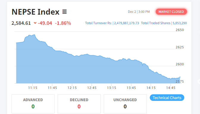 काठमाडौं । नेपाल राष्ट्र बैंकले पहिलो त्रैमाशिक मौद्रिक नीतिको समिक्षामा शेयर धितोकर्जामा लगाएको ४/१२ करोड रुपैयाँको सिमालाई संवोधन नगरे सँगै ठुला लगानीकर्ताहरुले शेयर बिक्री गर्दा बजारमा पहिरो गएको छ । मौद्रिक समिक्षामा यो विषयलाई संवोधन नगर्ने कुरा बाहिरिए एता दोस्रो बजारमा २३५ अंकको पहिरो गएको छ । साताको अन्तिम दिन आज नेप्से सूचक ४९.०४ अंकले घटेर २५८४.६१ अंकमा रोकिएको छ । आज सम्पुर्ण सूचक तथा उपसूचक घटेका छन् ।