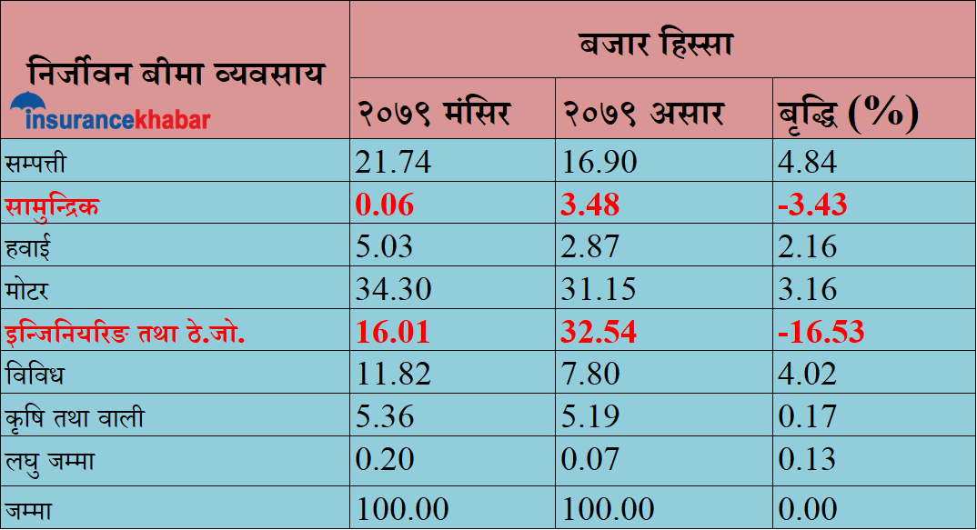 बैंकहरुले विस्तारै कर्जा प्रवाह गर्न थालेकाले गत असारको तुलनामा यस मंसिर महिनासम्ममा सम्पत्ती बीमाको हिस्सामा केहि बृद्धि भएको छ । गत असारमा सम्पत्ती बीमाको बजार हिस्सा १६ प्रतिशत मात्रै रहेकोमा मंसिर महिनासम्ममा २१.७४ प्रतिशत पुगेको छ । कम्पनीहरुले सम्पत्ती बीमा मार्फत मंसिर महिनासम्ममा तीन अर्ब ४७ करोड रुपैयाँ आर्जन गरेका छन् ।