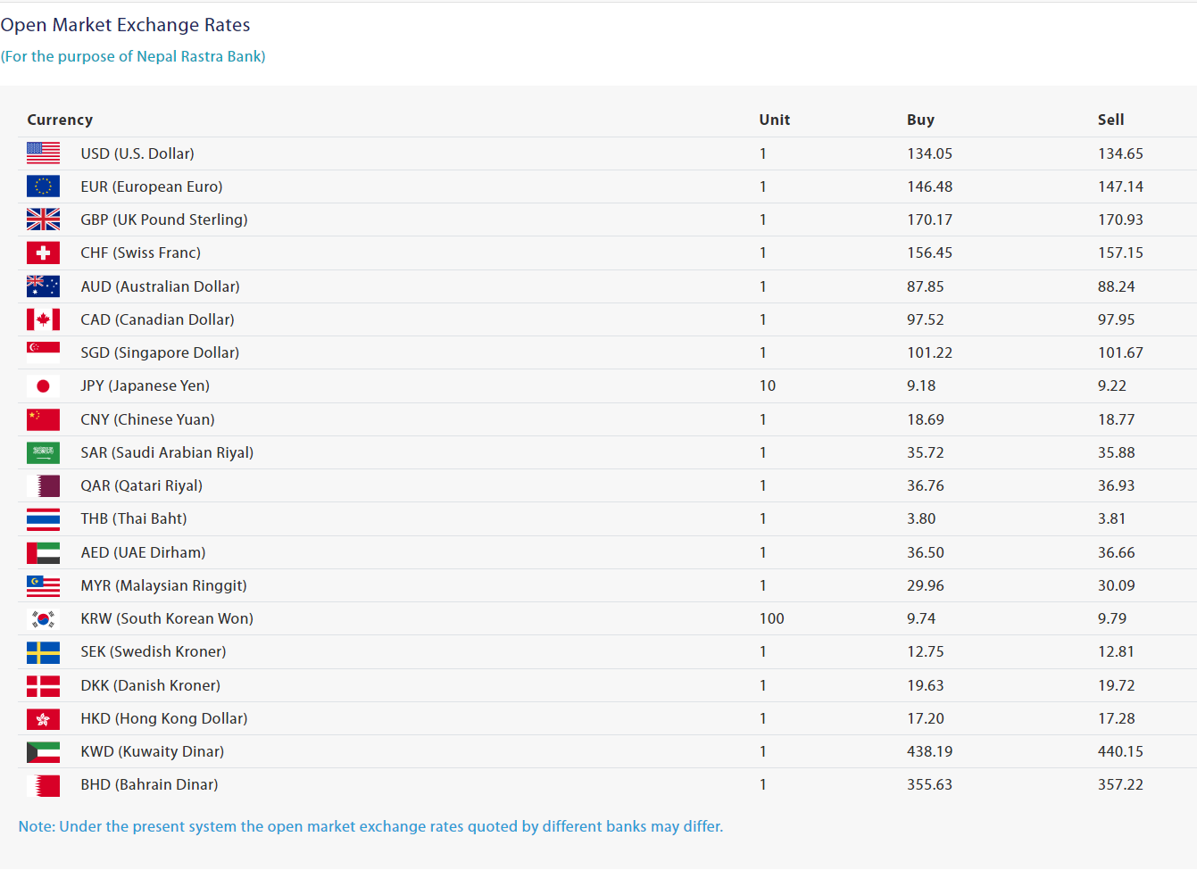 आज युरोपियन युरो एकको खरिददर १४६ रुपैयाँ ४८ पैसा र बिक्रीदर १४७ रुपैयाँ १४ पैसा रहेको छ । बेलायती पाउण्ड स्टर्लिङ एकको खरिददर १७० रुपैयाँ १७ पैसा र बिक्रीदर १७० रुपैयाँ ९३ पैसा छ।