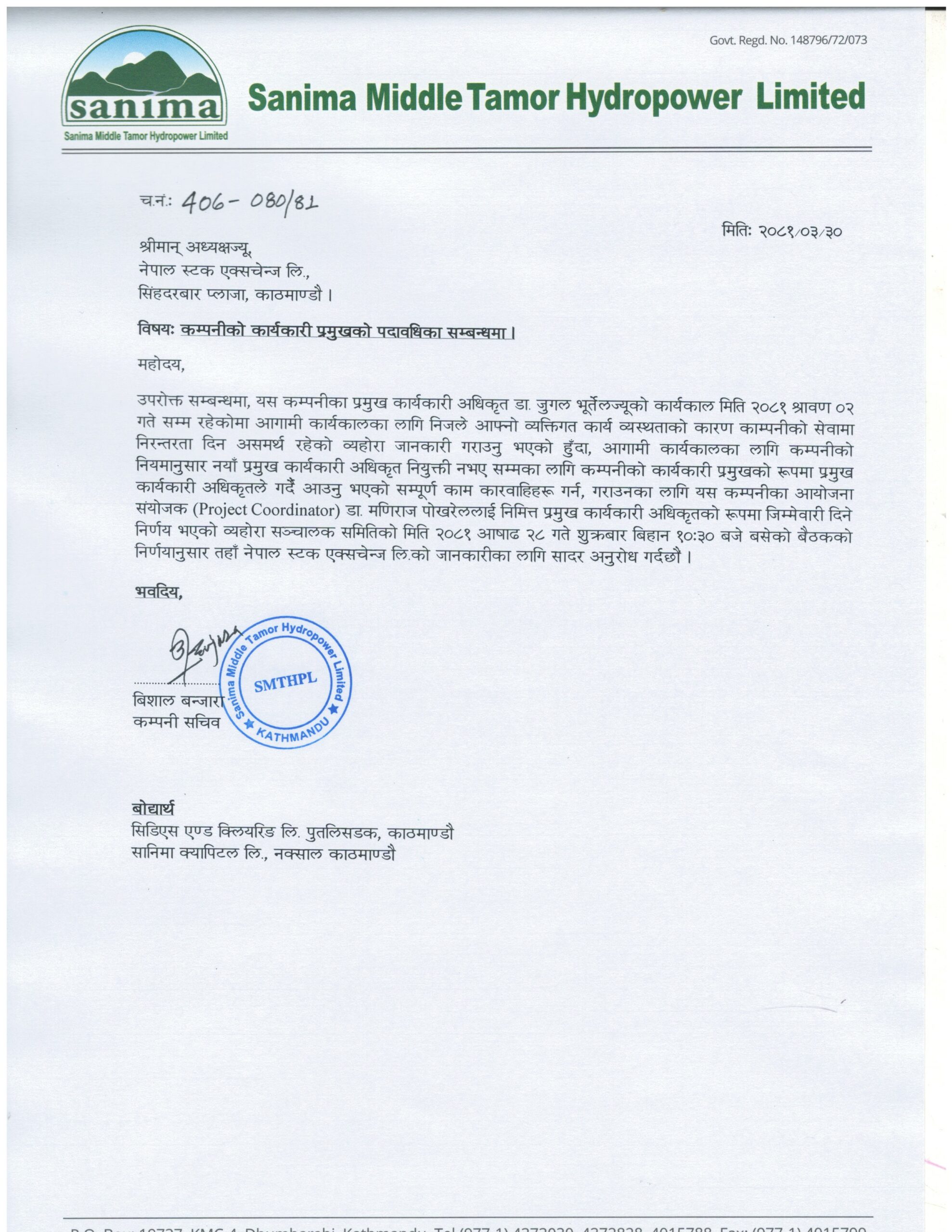 काठमाडौं । सानिमा मिडिल तमोर हाइड्रोपावरको निमित्त प्रमुख कार्यकारी अधिकृतको जिम्मेवारी डा. मणिराज पोखरेलले पाएका छन् । कम्पनीको गत असार २८ गते बसेको सञ्चालक समितिको बैठकले यस अघिका सिइओ डा. जुगल भूर्तेलको कार्यकाल २०८१ साउन २ गतेसम्म रहेकोमा निजले व्यक्तिगत कार्य व्यस्तताको कारण सेवामा निरन्तरता दिन असमर्थ रहेको उल्लेख गरेपछि नयाँ सीईओ नियुक्त नभएसम्मका लागि पोखरेललाई उक्त जिम्वेवारी दिने निर्णय गरेको हो ।