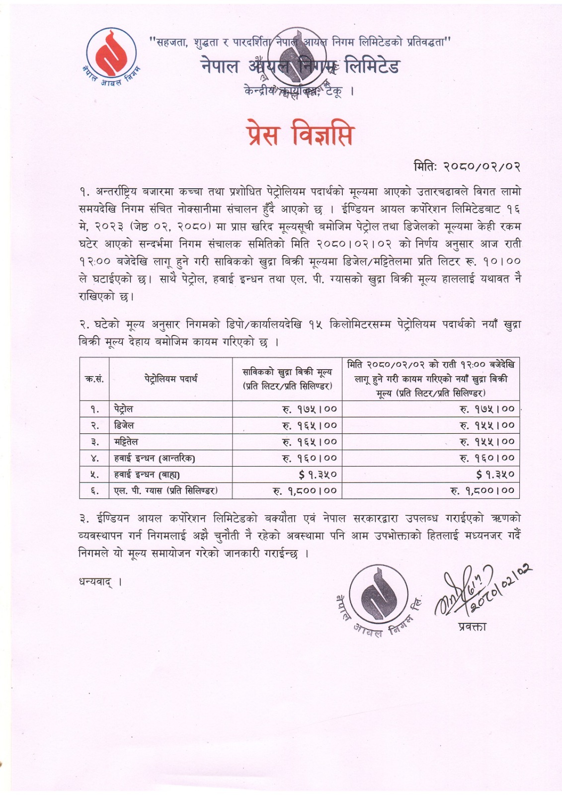 काठमाडौं । नेपाल आयल निगमले डिजेल र मट्टीतेलको मूल्य लिटरमा १० रुपैयाँले घटाएको छ । मंगलवार बसेको निगम सञ्चालक समितिको बैठकले मूल्य घटाउने निर्णय गरेको हो । अब डिजेल र मट्टीतेलको प्रतिलिटर मूल्य १५५ रूपैयाँ कायम भएको छ । यसअघि डिजेल र मट्टीतेलको मुल्य १६५ रूपैयाँ थियो । निगमले पेट्रोल, हवाई इन्धन र खाना पकाउने ग्याँसको मूल्य भने यथावत राखेको जनाएको छ ।