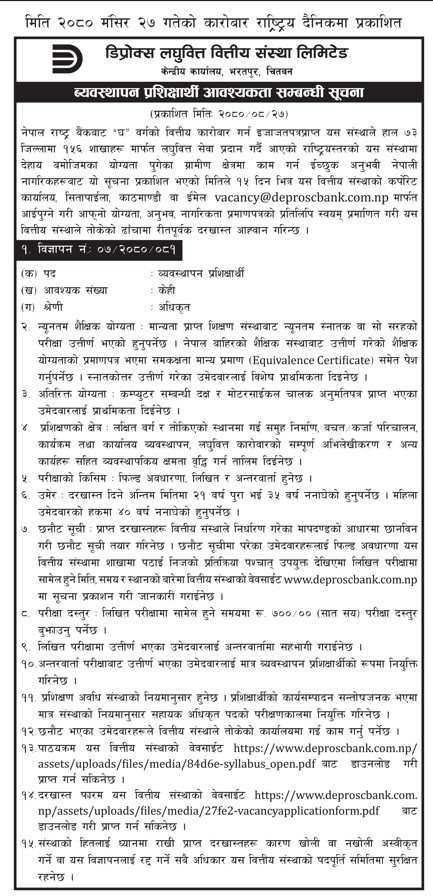 काठमाडौं । डिप्रोक्स लघुवित्त वित्तीय संस्थाले कर्मचारी माग गरेको छ । कम्पनीले ब्यवस्थापन प्रशिक्षार्थीका लागि केहि सख्यामा कर्मचारी माग गरेको हो ।