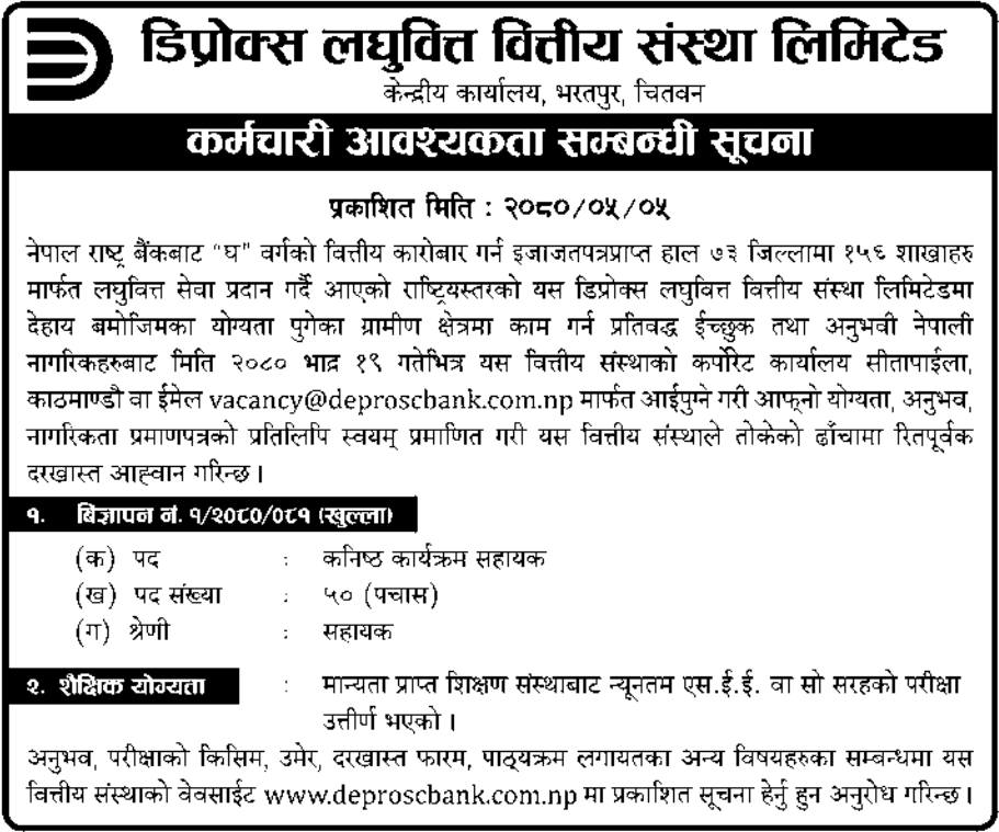 काठमाडौं । डिप्रोक्स लघुवित्त वित्तीय संस्था लिमिटेडले दरखास्त आब्हान गरेको रोजगारीको लागि आवेदन दिने आज अन्तिम दिन रहेको छ । कम्पनीले कनिष्ठ कार्यक्रम सहायकका लागि ५० जना कर्मचारी माग गरेको हो । उक्त पदका लागि शैक्षिक योग्यता न्यूनतम एसईई वा सो सरहको परीक्षा उत्तिर्ण गरेको हुनुपर्नेछ । कम्पनीले आफ्नो केन्द्रीय कार्यालय तथा शाखा कार्यालयका लागि कर्मचारी माग गरेको हो । ईच्छुक तथा योग्यता पुगेका ब्यक्तिले आवश्यक कागजात संकलन गरी आज भदौ १९ गतेसम्म कम्पनीको कर्पोरेट कार्यालय सीतापाईला काठमाडौंमा वा इमेल मार्फत आवेदन दिनुपर्नेछ ।