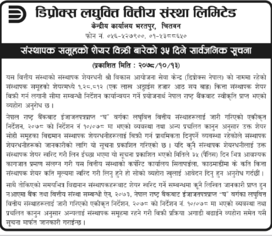 संस्थालले एक सूचना प्रकाशन गर्दै नेपाल राष्ट्र बैंकको निर्देशन बमोजिम सर्वप्रथम संस्थाका संस्थापक सेयरधनीहरुलाई नै प्राथमिकता दिनुपर्ने भएकाले संस्थापक सेयर खरिद गर्न इच्छुक संस्थापक शेयरधनीहरुलाई सूचना प्रकाशन भएको मितिले ३५ दिनभित्र आवश्यक कागजपत्र संकलन गरेर संस्थाको कर्पोरेट कार्यालय, सितापाईला काठमाडौंमा आइपुग्ने गरी निवेदन दिन आग्रह गरेको छ ।
