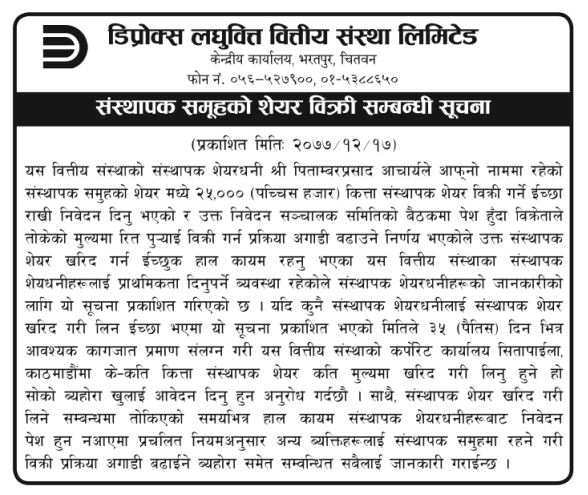 काठमाडौं । डिप्रोक्स लघुवित्त वित्तीय संस्था लिमिटेडले संस्थापक शेयर विक्री गर्ने भएको छ । संस्थाको शेयरधनी पिताम्बर प्रसाद आचार्यको नाममा रहेको २५ हजार कित्ता संस्थापक शेयर विक्री गर्ने संस्थाले जनाएको छ ।