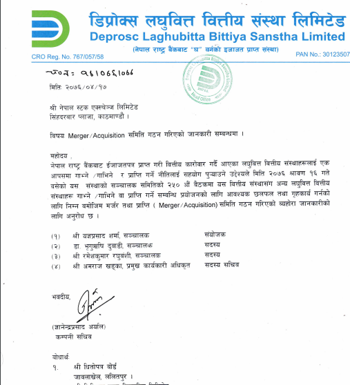 डिप्रोक्ससँग अन्य लघुवित्त वित्तीय संस्थाहरु गाभ्ने र गाभिने वा प्राप्ति गर्ने सम्बन्धी प्रयोजनका लागि आवश्यक छलफल तथा गृहकार्य गर्न समिति गठन गरेको जनाएएको छ ।