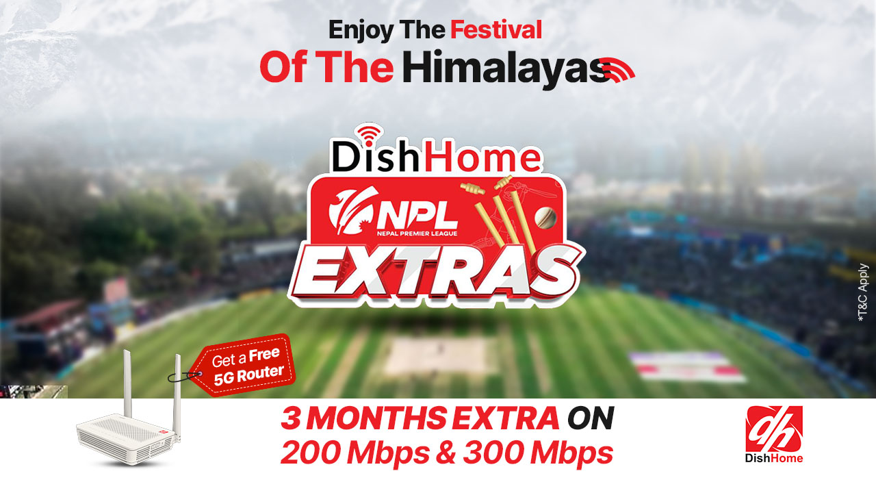 काठमाडौं । नेपाल प्रिमियर लिगको सुरूवातसँगै डिशहोमले नेपाल प्रिमियर लिगका फ्यानहरूलाई लक्षित गर्दै आफ्नो ईन्टरनेट सेवामा आकर्षक अफर सार्वजनिक गरेको छ। कम्पनीले २०० एमपीबीएस र ३०० एमपीबीएस वार्षिक इन्टरनेट प्याकेजहरूमा थप ३ महिनाको बोनस सहीत निःशुल्क राउटरको अफर ल्याएको छ।