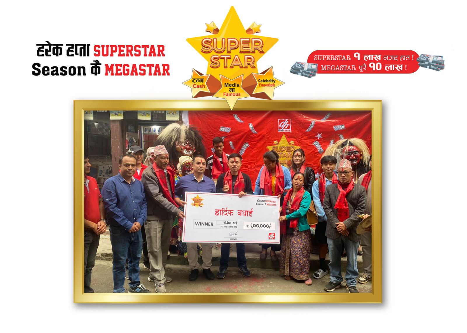 काठमाडौं । “हरेक हप्ता सुपरस्टार सिजनकै मेगास्टार” योजना अन्तर्गत मानेभञ्ज्याङ, ओखलढुंगाका रजिन राईले जितेको पुरस्कार रकम हस्तान्तरण गरिएको छ । राईको घरमानै पुगेर डिश मिडिया नेटवर्कका प्रतिनिधीले नगद एक लाख हस्तान्तरण गरेको हो । वाजागाजा सहित एक कार्यक्रमको आयोजना गरि सम्मान सहित उक्त पुरस्कार रकम प्रदान गरिएको थियो । २०८० असोज २२ गते सोमवार भएको लक्की ड्र मार्फत ओखलढुंगाका राईले नगद रु एक लाख जितेका हुन् ।