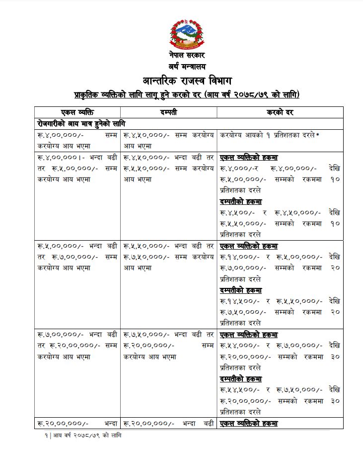 सरकारले पनि हरेक वर्ष व्यक्तिले गर्ने आयआर्जनमा लिने करको दायरा फरक गरिरहेको हुन्छ। व्यक्तिको आयआर्जन कर पनि राज्यले विभिन्न तवरबाट सङ्कलन गर्दै आएको छ। सोहीअनुरूप सरकारले पनि आर्थिक वर्ष २०७८/०७९ का लागि आयकरको दर निर्धारण गरिसकेको छ। निर्धारण भएको कर साउन १ गतेबाट लागू भैसकेको छ ।
