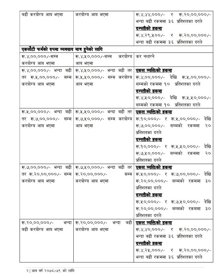२० लाखभन्दा बढी आम्दानीको हकमास् २० लाख रुपैयाँसम्म यस अगाडी हिसाब गरिएजस्तै ४ लाख ४४ हजार रुपैयाँ र त्यसभन्दा माथिको रकममा ३६ प्रतिशतका दरले कर ।