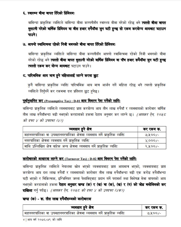 ४ लाख रुपैयाँसम्म कमाई गर्ने व्यक्तिको हकमा वार्षिक लाग्ने आयकर १ प्रतिशतको दरले ४ हजार रुपैयाँ ।