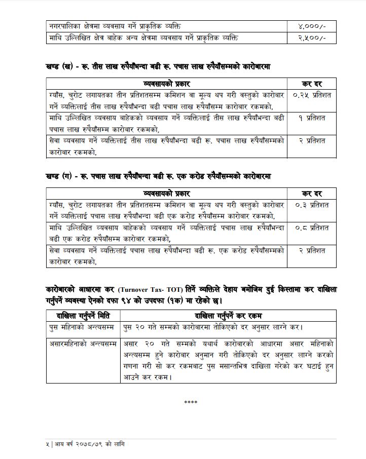 वार्षिक आम्दानी ४ लाख भन्दा बढी तर ५ लाख रुपैयाँ भन्दा कम भएको खण्डमा सुरुको ४ लाखको १ प्रतिशत र बाँकी रहेको १ लाखको १० प्रतिशतका दरले बढीमा १४ हजार रुपैयाँ ।