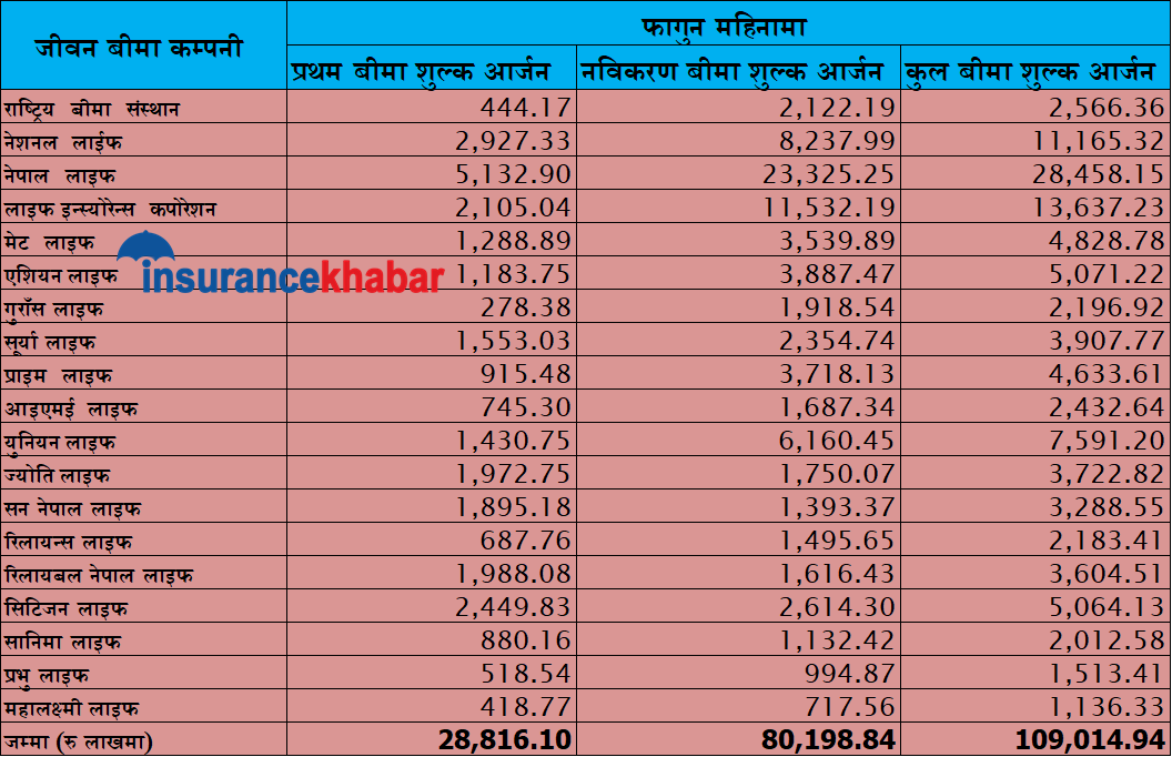 ज्योति लाइफले फागुन महिनामा ३७ करोड २२ लाख रुपैयाँ प्रथम बीमा शुल्क आर्जन गर्दा नविकरण भने १७ करोड ५० लाख रुपैयाँ रहेको छ । रिलायबल नेपालले भने ३६ करोड ४ लाख रुपैयाँ बीमा शुल्क आर्जन गर्दा नविकरण तर्फ नै १९ करोड ८८ लाख रुपैयाँ आर्जन गर्न सफल भएको छ ।