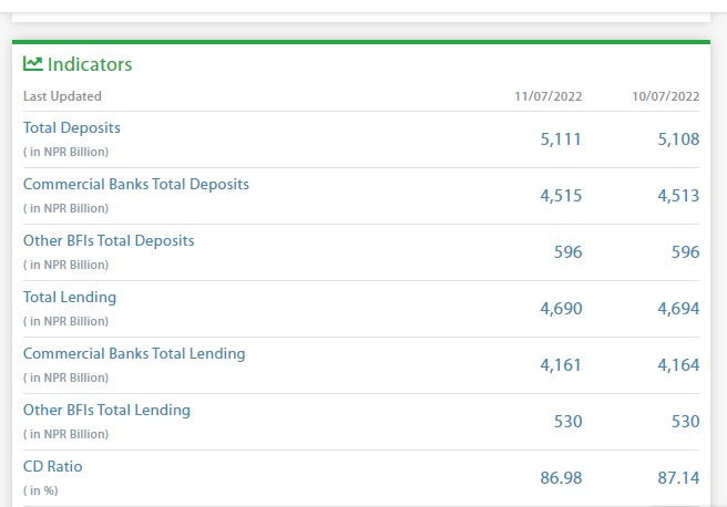 नेपाली बैंकिङ प्रणालीमा असार २७ गतेसम्म ५१ खर्ब ११ अर्ब निक्षेप पुगेको छ। असार २६ गतेको तुलनामा निक्षेप एकै दिन करिव ३ अर्बले वृद्धि भएको हो। निक्षेप वृद्धि भए पनि कर्जा प्रवाह भने एकै दिन ४ अर्बले घटेको छ। निक्षेप वृद्धि हुँदा तर कर्जा प्रवाह घट्दा सिडी रेसियो घट्न पुगेको हो।