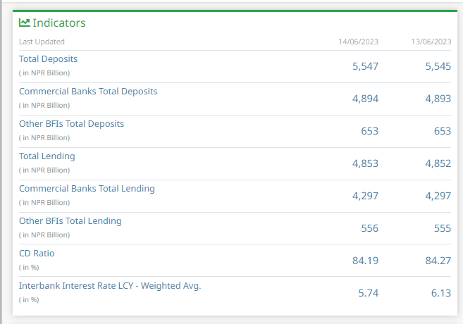त्यस्तै बैंकहरूमा एकै दिन २ अर्बले निक्षेप वृद्धि भएको छ । जेठ ३० गते ५५ खर्ब ४५ अर्ब रहेको निक्षेप जेठ ३१ गते ५५ खर्ब ४७ अर्ब पुगेको छ । बजारमा कर्जाको माग कम हुँदा र निक्षेप निरन्तर वृद्धि हुँदा सिडी रेशियो पनि घटेको छ । जेठ ३१ गते ८४ दशमलव १९ प्रतिशत सिडी रेसियो कायम भएको छ । अघिल्लो दिन सिडी रेसियो ८४ दशमलव २७ प्रतिशत थियो ।