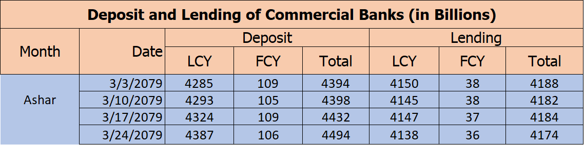 असार महिनाका चार सातामा बाणिज्य बैंकहरुले निक्षेप संकलन ९४ अर्बले बृद्धि गर्दा कर्जा लगानी १९ अर्बले खुम्चिएको छ । बैंकर्स संघका अनुसार असार २४ गतेसम्ममा बाणिज्य बैंकहरुले ४४ खर्ब ९४ अर्ब रुपैयाँ निक्षेप संकलन गरेका छन् । जवकी जेठ अन्तिम दिन बाणिज्य बैंकहरु सँग निक्षेप संकलन ४४ खर्ब मात्रै थियो ।