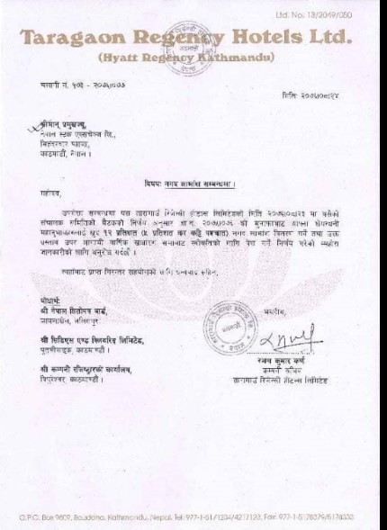 काठमाडौं । तारागाँउ रिजेन्सी होटलले आर्थिक बर्ष २०७५।७६ को मुनाफाबाट शेयरधनीलाई १२ प्रतिशत नगद लाभांस वितरण गर्ने घोषणा गरेको छ । कम्पनीको यही मंसिर २३ गते बसेको संचालक समितिको बैंठकले नगद लाभांस घोषण गरेको हो ।