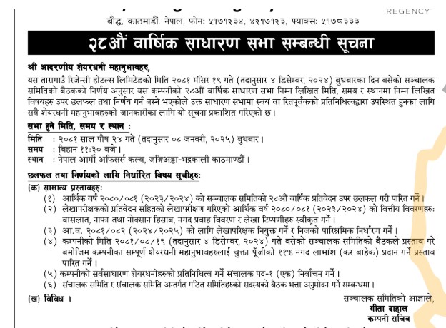 काठमाडौं । तारागाउँ रिजेन्सी होटल्स लिमिटेडले पुस २४ गते २८ औँ वार्षिक साधारण सभा गर्ने भएको छ । उक्त सभा नेपाल आर्मी अफिसर्स क्लब, भद्रकाली, काठमाडौंमा आयोजना गर्ने जनाएको हो । सभा बिहान साढे ११ बजे शुरु हुनेछ।