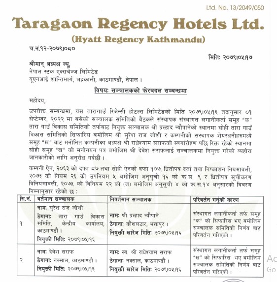काठमाडौं । तारागाउँ रिजेन्सी होटेल्स लिमिटेडमा सञ्चालक फरेबदल भएका छन् । होटेल्सको भदौ १६ गते बसेको सञ्चालक समितिको बैठकले संस्थागत लगानीकर्ता तारा गाउँ विकास समितिको तर्फबाट नियुक्त सञ्चालक प्रल्हाद न्यौपानेको स्थानमा सुरेशराज जोशी र कम्पनीको अध्यक्ष राधेश्याम सराफको स्वर्गारोहण पछि रिक्त पदमा देवेश सराफलाई सञ्चालक नियुक्त गरेको हो ।