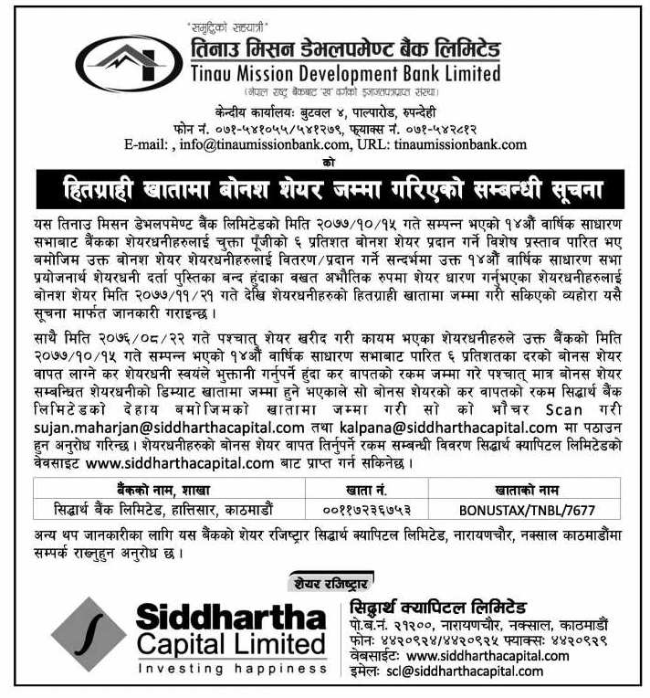 काठमाडौँ । तिनाउ मिसन डेभलपमेन्ट बैंक लिमिटेडले आफ्ना शेयरधनीहरूको हितग्राही खातामा बोनश शेयर जम्मा गरेको छ । बैंकको माघ १५ गते, सम्पन्न भएको १४औँ वार्षिक साधारण सभाले पारित गरेको ६ प्रतिशत बोनश शेयरधनीको हितग्राही खातामा जम्मा गरेको हो ।