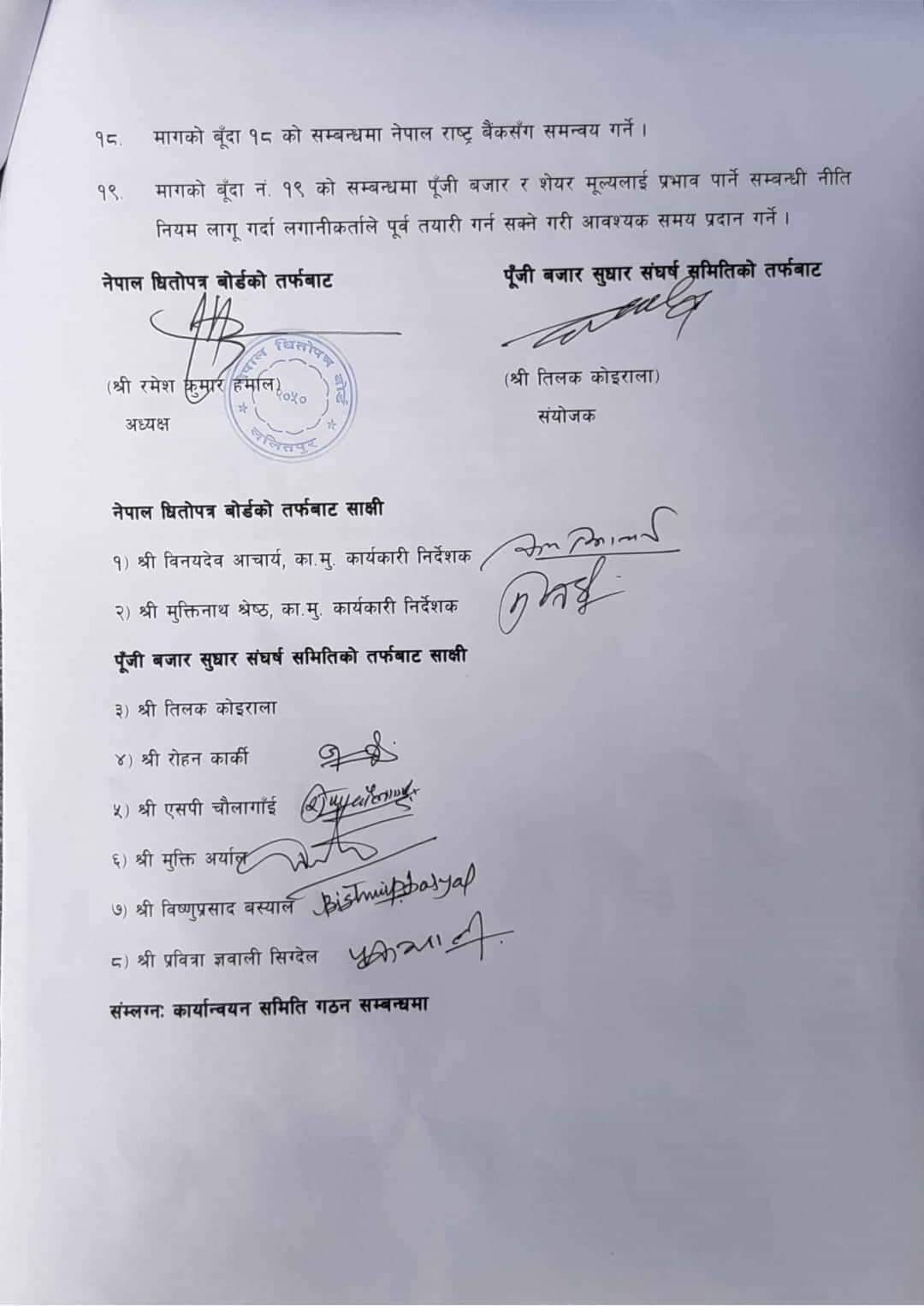 कोईरालाले नेपाल धितोपत्र बोर्ड सँग १९ बुँदे माग पुरा गर्ने सहमतिपत्रमा हस्ताक्षर गरे सँगै अनसन तोडेका हुन् । कोईरालाको माग र नेपाल धितोपत्र बोर्डको माग एउटै भएकाले आगामी दिनमा माग पुरा गर्ने सहमतिपत्रमा हस्तारक्ष भएको अध्यक्ष हमालले जानकारी दिए । उनले भने ‘भोलि शनिवार भयो अव आइतबारदेखि माग कार्यान्वयन समितिले कामहरु अगाडी बढाउनेछ ।’