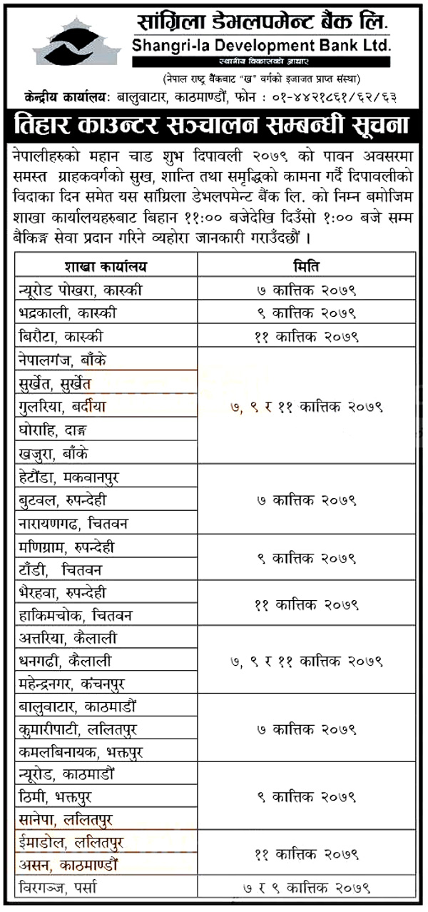 काठमाडौं । सांग्रिला डेभलपमेन्ट बैंक लिमिटेडले तिहारको बिदामा पनि बैंकिङ सेवा दिने जनाएको छ । बैंकले आफ्ना ग्राहकहरुलाई केही सीमित शाखाहरुबाट बैकिङ्ग सेवा सुविधा प्रदान गर्ने भएको छ । बैंकले कात्तिक ७ गतेदेखि कात्तिक ११ गतेसम्म २७ वटा शाखा कार्यालयहरु संचालन रहने जनाएको छ ।