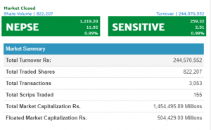 नेप्से परिसूचक साताको पहिलो दिन ११ दशमलव ९२ अङ्कले बढेर १२१९ दशमलव २० अङ्कमा बन्द भएको छ । कारोबार रकम २४ करोड ४५ लाख रुपैयाँ पुगेको छ ।