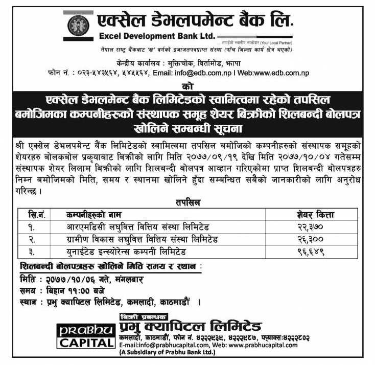 काठमाडौं । एक्सेल डेभलपमेन्ट बैंक लिमिटेडले पुस १९ गते, आइतबारबाट माघ ४ गतेसम्म बिक्री खुल्ला गरेको ३ वटा कम्पनीको लिलामी शेयरमा परेका बोलपत्रहरू आज खोलिने भएको छ । उक्त बोलपत्रहरू निष्कासन तथा बिक्री प्रबन्धक प्रभु क्यापिटल लिमिटेड, कमलादी, काठमाडौँमा बिहान ११ बजे खोलिने बैंकले जनाएको छ ।